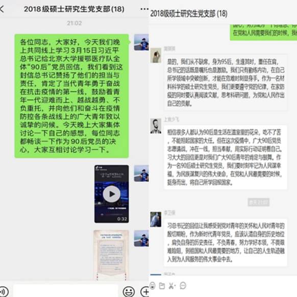 3月15日,中共中央总书记、国家主席、中央军委主席习近平给北京大学援鄂医疗队全体“90后”党员回信,在信中赞扬了他们的担当与责任,肯定了当代青年勇于奋战在抗击疫情的第一线,鼓励着青年一代迎难而上、越战越勇、不负重托,并向他们和奋斗在疫情防控各条战线上的广大青年致以诚挚的问候。3月19日晚上,我院2018级硕士党支部开展线上集体学习此次回信精神,并展开积极讨论。